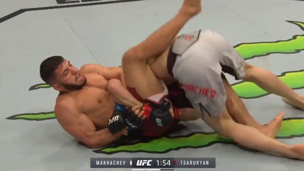 Round 4: Tsarukyan presses, landing a combination, but Makhachev counters with a takedown at 1:30, transitioning to an arm-triangle choke at 4:20 as Tsarukyan taps. Makhachev lands 14 of 26 strikes in the round. @UFC_CA confirms the submission, tweeting, “Makhachev’s a choke artist—Abu Dhabi goes wild!”